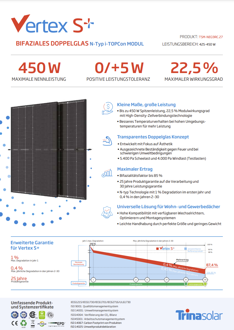 Das neue Trina Vertex S+ NEG9RC.27 überzeugt mit einer Nennleistung von bis zu 440 Wp und einem Wirkungsgrad von 22,0%. So können Sie mehr Energie erzeugen und Ihre Stromrechnung senken. Das Modul ist mit einer 25-jährigen Produktgarantie und einer 30-jährigen linearen Leistungsgarantie ausgestattet. Das bedeutet, dass Sie sich keine Sorgen um die Lebensdauer des Moduls machen müssen und es Ihnen über viele Jahre hinweg zuverlässig Energie liefern wird. Das Trina Vertex S+ NEG9RC.27 Solarmodul ist bifazial und kann Sonnenlicht von beiden Seiten aufnehmen, was zu einer höheren Energieerzeugung führt. Der Glas-Glas-Aufbau führt zu einer hohen Robustheit des Solarmoduls gegen witterungsbedingte Einflüsse. Durch die neue n-Typ TOPcon Technologie werden geringe Degradationswerte erreicht, sodass Trina nach 30 Jahren immer noch 87,4% der Anfangsleistung garantiert.