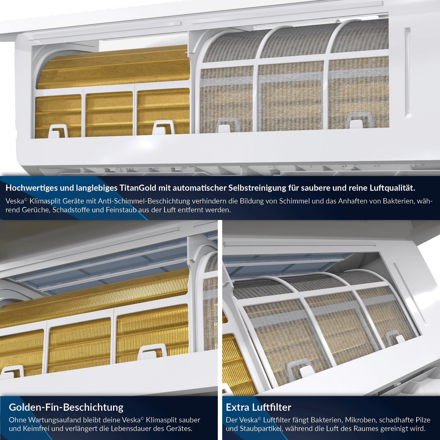 Die Klimaanlage von VESKA mit Inverter Technologie, ausgestattet mit einem beleuchteten LCD-Display und einer Fernbedienung und WiFi/App Funktion, läuft leise und zeichnet sich durch eine lange Lebensdauer. Das antibakterielle Klimagerät arbeitet mit einer üblichen 230V Haushaltsspannung und ist außerordentlich leistungsstark, energiesparend und besonders geräuscharm. Durch die robuste Golden-Fin Antihaftbeschichtung der Innen- und Außeneinheit bleibt diese stets sauber und garantiert eine lange Lebensdauer. Zudem verhindert die Beschichtung das Ansiedeln von Bakterien und Pilzen auf den Lamellen. So profitieren Sie von gesunder und frischer Luft ohne unangenehme Gerüche. Zudem bleibt die Leistung der Anlage über viele Jahre konstant hoch und die Stromkosten gering.